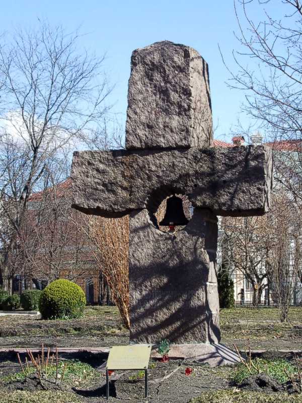 Пам’ятний хрест церквам, знищеним большевикамиРозмір зображення: 600:800 піксел Фото М. І. Жарких, 23 березня 2021 р. На табличці перед хрестом – напис: «Тут спочиває Герой України Георгій Гонгадзе 1969 – 2000» [його поховано 22.03.20216 р.] |
