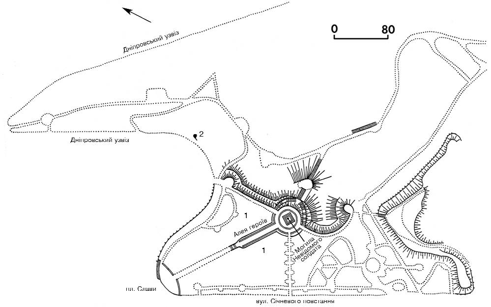 Вул. Січневого повстання. На верхній та середній наддніпровських терасах, між вул. Січневого повстання та Дніпровським узвозом. З півдня обмежений валами Старої Києво-Печерської фортеці (цитаделі). Включає Меморіал Вічної Слави з пам’ятником на могилі Невідомого солдата. Головний вхід з пл. Слави. Пл. – 18,37 га.