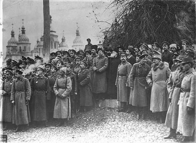 1917 р. М.Грушевський і С.Петлюра на мітингуРозмір зображення: 640:467 піксел Симон Петлюра (в центрі, ліворуч від М. Грушевського) на мітингу в час проведення ІІІ Військового з’їзду. Київ. 2 листопада 1917 р. |