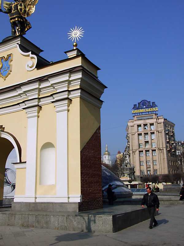 2012 р. Перспектива від майдану НезалежностіРозмір зображення: 600:800 піксел Ліворуч – фрагмент відновленої Печерської брами, праворуч – будинок по вул.Софійській, 2. 19 березня 2012 р. Фото М.І.Жарких. |