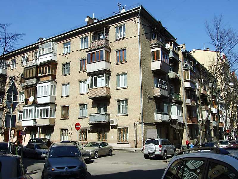 Загальний вигляд (ліворуч – вул. Стрітенська, праворуч – вул. О.Гончара і будинок по вул. О.Гончара, 6). 8 квітня 2009 р. Фото М.І.Жарких.