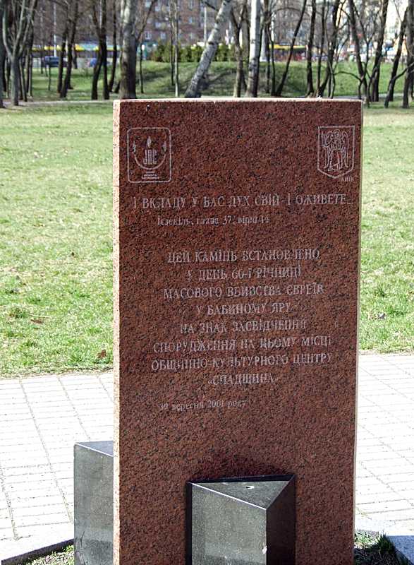 Цей камінь встановлено в день 60-ї річниці масового вбивства євреїв у Бабиному Яру на знак засвідчення спорудження на цьому місціїобщинно-культурного центру «Спадщина». 30 вересня 2001 року.»
