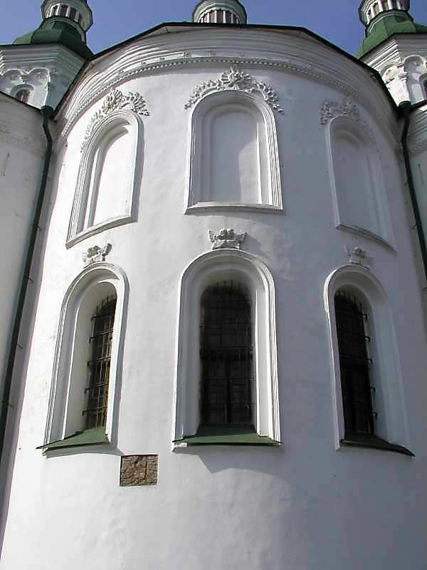 2005 р. Центральна апсида. Вигляд зі сходу Розмір зображення: 600:800 піксел 13 квітня 2005 р. Фото М.І.Жарких. Вкладені елементи Вікна (+) Південне вікно Середня ніша Південна ніша