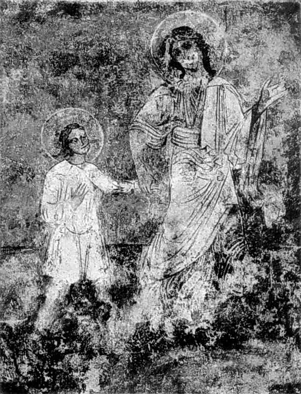 Іоаким веде Якова в пустинюРозмір зображення: 612:800 піксел Іоаким веде Якова в пустиню. Фреска з Кирилівської церкви в Києві. Середина XII ст. Джерело: Історія українського мистецтва. – К.: Наукова думка, 1966 р., т. 1, с. 313. |