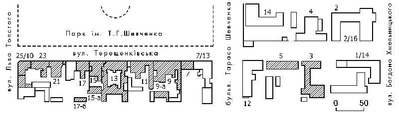 Не зберігся будинок № 5, в якому з 1875 проживав Н. Терещенко.