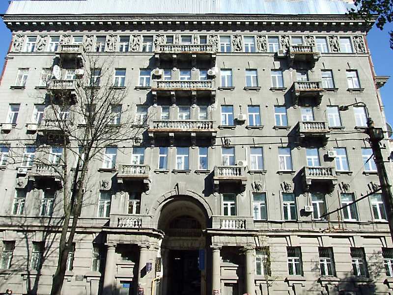 2009 р. Головний фасад Розмір зображення: 800:600 піксел 21 квітня 2009 р. Фото М.І.Жарких. Найчастіше переглядають Фриз (+) Балкони 5-7-го поверхів (+) Вікна 3-го поверху (+) Вкладені елементи [2] Фриз (+) Балкони 5-7-го поверхів (+) Балкон 4-го поверху Вікна 3-го поверху (+) Портал (+)
