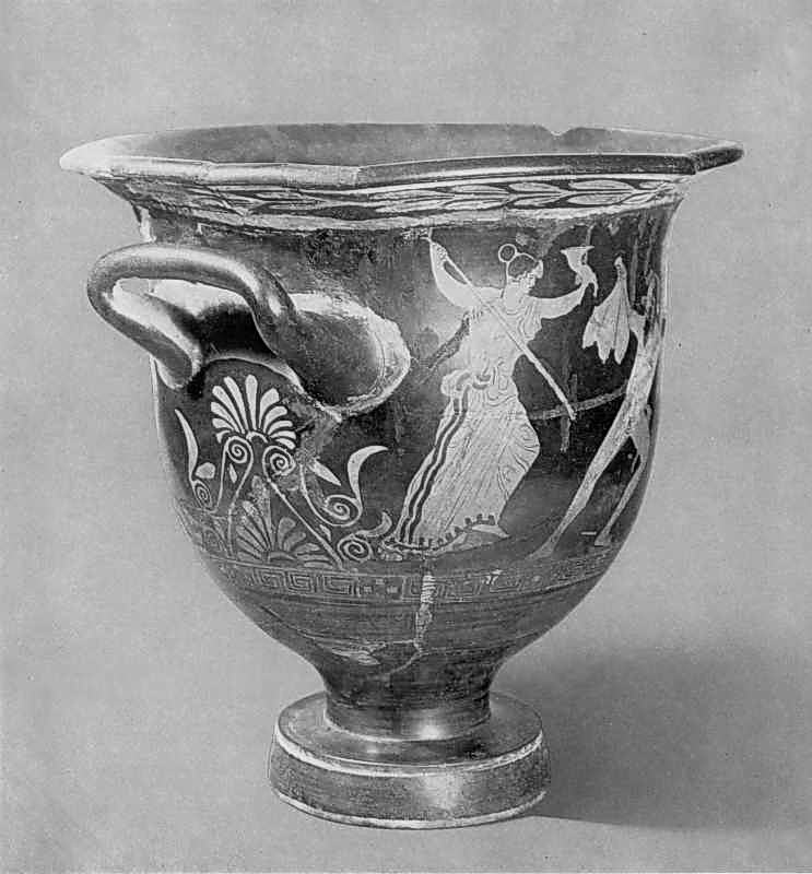 Кратер червонофігурний з зображенням воїнського танцю з кургану скіфського часу поблизу Києва. Розпис «Київського майстра». Аттіка. V ст. до н. е. Глина. Висота 35 см. Київський музей західного та східного мистецтва.