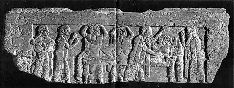 Барельєф зі сценою оплакування померлого (стінка оссуарія). Етрурія. V ст. до н. е. Вапняк. Висота 15,5 см. Київський музей західного та східного мистецтва.