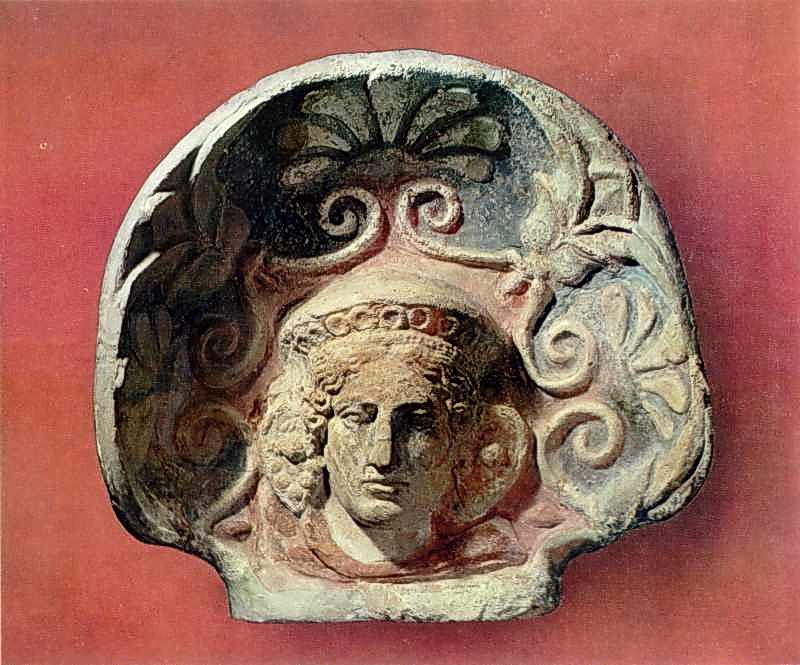 Антефікс у вигляді голови менади, оточеної мушлею. Етрурія. V-IV ст. до н.е. Глина. Висота 50 см. Київський музей західного та східного мистецтва.