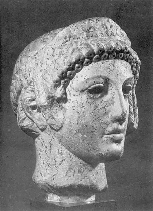 Голова богині. Римська робота І-II ст. н.е., що наслідує грецьким зразкам архаїчної епохи. Мармур. Висота 29 см. Київський музей західного та східного мистецтва.
