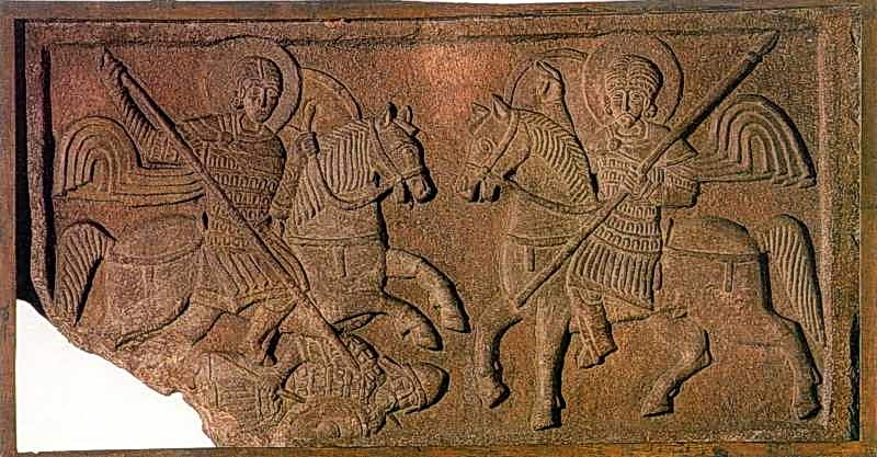 Шиферна різьблена плита із зображенням св. Дмитрія та невідомого св. воїна. XII ст. Державна Третьяковська галерея (Москва).