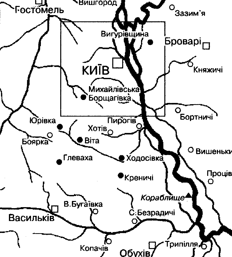 Володіння монастиря в межах КиївщиниРозмір зображення: 936:1036 піксел Володіння монастиря в межах Київщини. Затемнені населені пункти – власність монастиря. Джерело: Пам’ятки України, 1999 р., № 1, с. 94. |