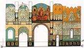 Святослав і Всеволод, що по смерті Ярослава посідали київський престіл і активно боролися за нього, мали різну культурну орієнтацію. Всеволод і його син Володимир Мономах були наближені до візантійських владущих кіл і мали прогрецьку орієнтацію (13). Святослав натомість підтримував тісний зв’язок із західною церквою, дослідники вказують на його розрив із київською (грецькою) митрополією (14). Для нас найважливішою є церковно-культурна орієнтація Ізяслава – батька фундатора Михайлівського собору. Вважається, що князь був прихильником кирило-мефодіївських традицій, обстоював слов’янську церкву й слов’янське богослужіння (15). Коли зводили Михайлівський Золотоверхий собор, кирило-мефодіївські традиції ще жили, хоронителем їх була Десятинна церква – головний храм Русі часів Володимира Святославича (тоді церковна організація мала деякі риси раннього християнства). Десятинна церква й далі лишалася пов’язана з кирило-мефодіївськими традиціями, тут, зокрема, ховали київських князів відповідної орієнтації (16), серед них поховано й князя Ізяслава – Святополкового батька. Михайлівський собор поставили в межах “города Ізяслава”, де вже стояв зведений Ізяславом Дмитріївський собор. З огляду на це, очевидно, не випадково Святополк Ізяславич обрав для оздоблення Михайлівського собору варіант іконографічної програми, що передбачала розміщення святого воїна Дмитрія і, певно, інших воїнів на стовпі Тріумфальної арки.