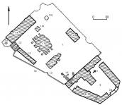 Окремою спорудою зображено на плані дерев’яну трапезну чоловічого монастиря навпроти західного фасаду Михайлівського собору: одноповерховий, у плані прямокутний будинок, перекритий чотирисхилим дахом з гостроверхим гребінцем, з невеличким, завершеним маленькою банькою вівтарем та ганком з трикутним дашком.
