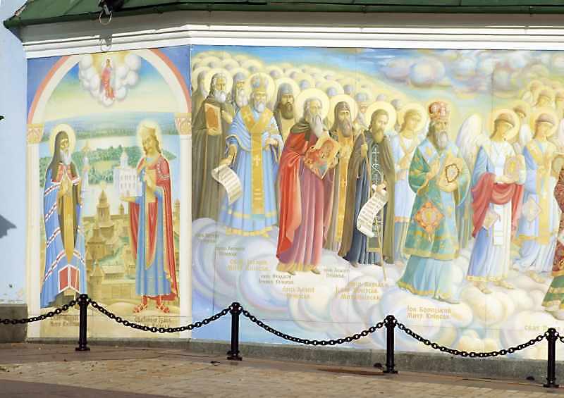Ліва частина Розмір зображення: 800:565 піксел 30 липня 2008 р. Фото М.І.Жарких. Вкладені елементи Митрополит Михаїл і кн.Святополк Ізяславич Півпостать Михаїла Архангел Михаїла Півпостать Святополка Преп.Нестор, Антоній Печерський, митрополит Іларіон Митрополит Іларіон, Феодосій Печерський Святі мужі (права частина) Св.Феодосій Печерський, Аліпій, Анапіт Св.Агапіт і Варлаам Митрополит Іов Борецький Митрополит Петро Могила і ангели-князі Ангели-князі Митрополит Петро Могила