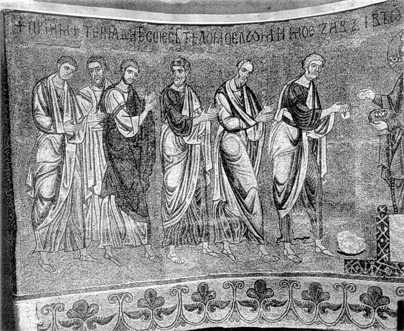 Апостоли. Ліва частина мозаїчної композиції «Євхаристія» з Михайлівського Золотоверхого собору в Києві. Початок XII ст.