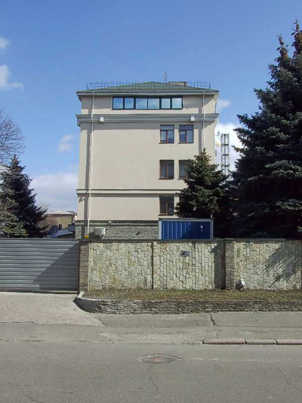 2021 р. Флігель. Вигляд із заходуРозмір зображення: 600:800 піксел Паркан і брама виходиять на вул. Оболонську, сам флігель поставлено на північ від головного будинку. Фото М. І. Жарких, 24 березня 2021 р. |