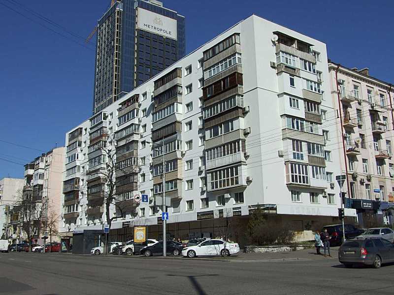2020 р. Загальний вигляд з півдняРозмір зображення: 800:600 піксел Ліворуч – вул. Велика Васильківська, праворуч – вул. Коновальця. Фото М. І. Жарких, 12 березня 2020 р. |