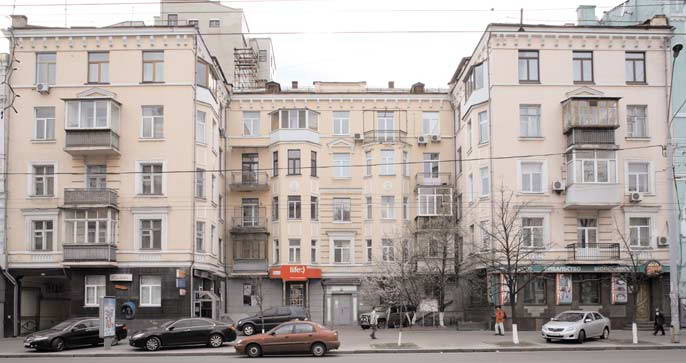 Вул. Червоноармійська, 108. Бічними крилами виходить на червону лінію забудови вулиці; в лівому крилі розташовано проїзд у двір; центральний об’єм будинку – з відступом від лінії вулиці, завдяки чому утворено невеликий курдонер.