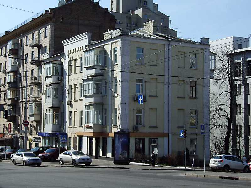 Житловий будинок (№ 130)Розмір зображення: 800:600 піксел Ліворуч – вул. Велика Васильківська, праворуч – вул. Ковпака. 2 квітня 2012 р. Фото М.І.Жарких. |