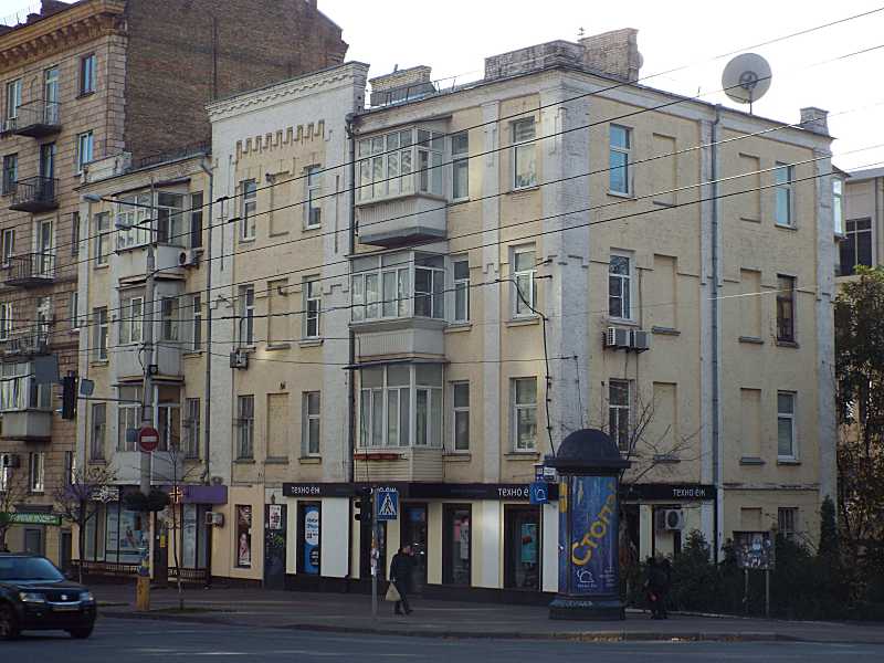 2017 р. Загальний виглядРозмір зображення: 800:600 піксел Житловий будинок, вул. Вел. Васильківська, 130. Ліворуч – вул. Великиа Васильківська, праворуч – вул. Ковпака. Фото Івана Парнікози, 22 жовтня 2017 р. |
