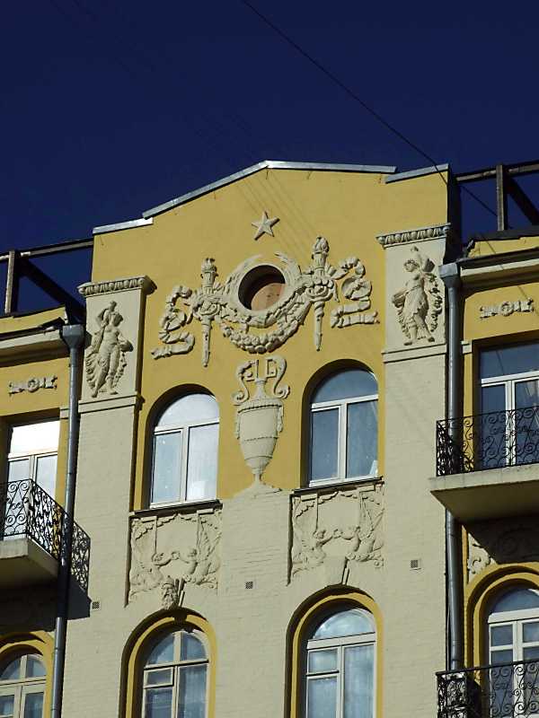 Фрагмент 5-6-го поверхів Розмір зображення: 600:800 піксел 2 квітня 2012 р. Фото М.І.Жарких. Вкладені елементи Рельєф на фронтоні Рельєфна прикраса пілястри