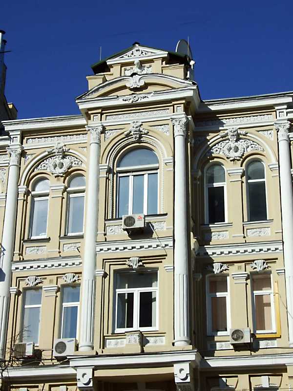 Центральна частина головного фасаду Розмір зображення: 600:800 піксел 2 квітня 2012 р. Фото М.І.Жарких. Вкладені елементи Фронтон Вікна 4-го поверху