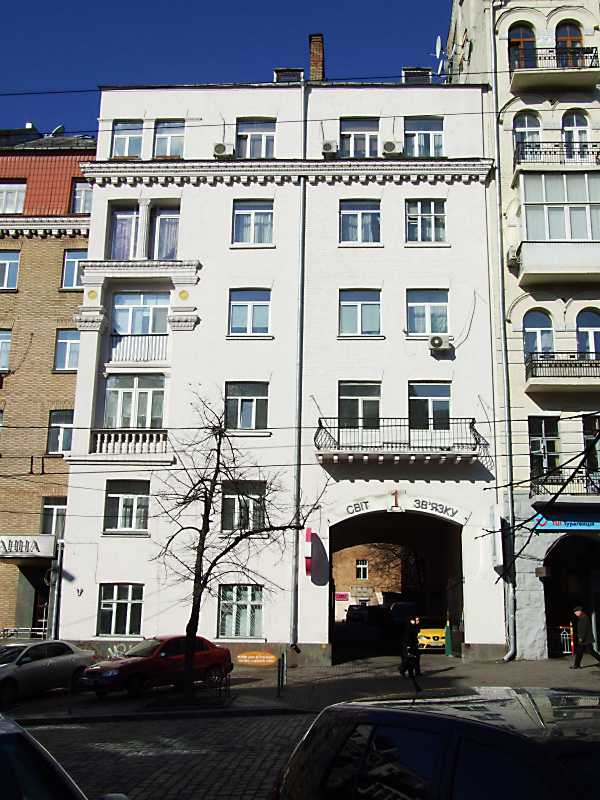 2012 р. Права частина головного фасаду Розмір зображення: 600:800 піксел 2 квітня 2012 р. Фото М.І.Жарких. Вкладені елементи Лоджія 3-4-го поверхів (+)