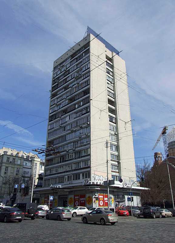 2020 р. Загальний вигляд з південного заходу (2)Розмір зображення: 577:800 піксел Ліворуч – вул. Вел.Васильківська, праворуч – вул. Жилянська. Фото М. І. Жарких, 13 березня 2020 р. |