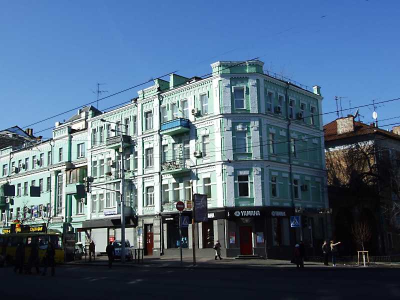 Житловий будинок (№ 86 / Димитрова, 9)Розмір зображення: 800:600 піксел Ліворуч – вул. Велика Васильківська, праворуч – вул. Димитрова. 2 квітня 2012 р. Фото М.І.Жарких. |