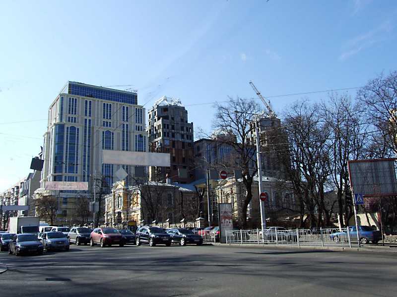 2012 р. Загальний вигляд у перспективі вул. Великої ВасильківськоїРозмір зображення: 800:600 піксел На тлі велетенських будинків по провулку Горького. 2 квітня 2012 р. Фото М.І.Жарких. |
