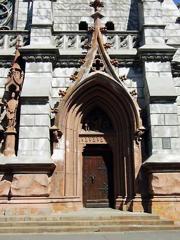 2009 р. Правий портал Розмір зображення: 600:800 піксел 22 квітня 2009 р. Фото М.І.Жарких. Вкладені елементи Рельєфна тяга Св.Микола (?) благословля короля (+) Консоль у вигляді ящірки Двері