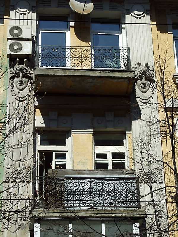 Фрагмент 3-4-го поверхів з маскаронами Розмір зображення: 600:800 піксел 8 квітня 2009 р. Фото М.І.Жарких. Вкладені елементи Ліва плачуча удова Права плачуча удова