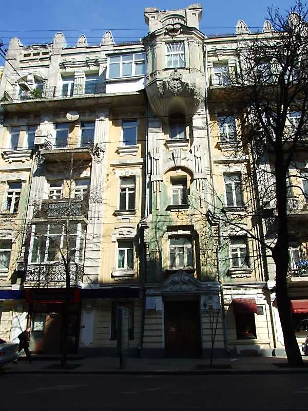 Центральна частина Розмір зображення: 600:800 піксел 9 квітня 2009 р. Фото М.І.Жарких. Вкладені елементи Балкон-еркер 5-го поверху (+) Вікно 3-го поверху (+) Вікно 2-го поверху Вхід (+)