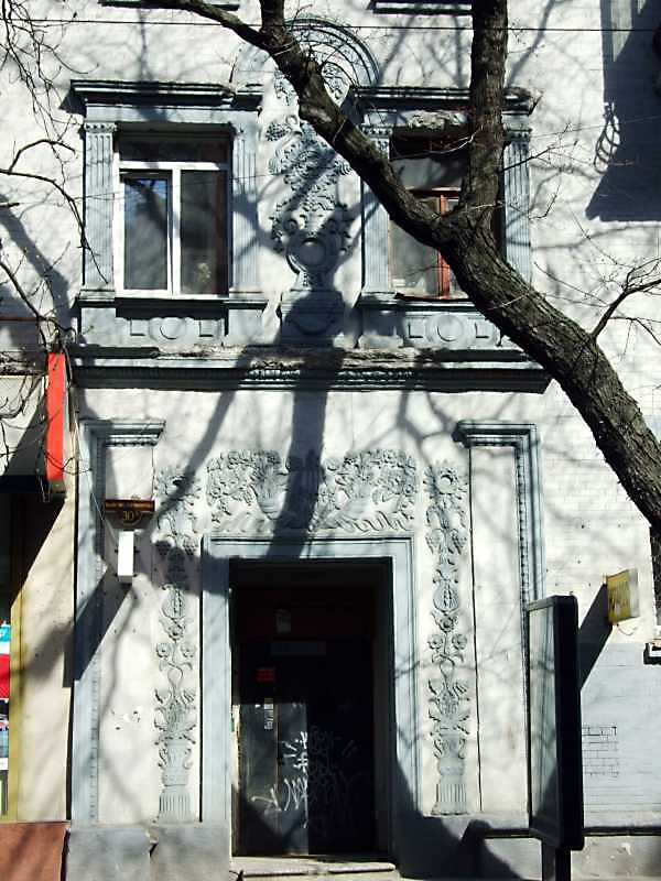 Центральна частина головного фасаду Розмір зображення: 600:800 піксел 9 квітня 2009 р. Фото М.І.Жарких. Вкладені елементи Рельєфна вставка Вхід