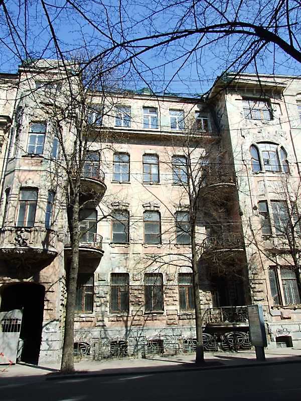 2009 р. Головний фасад Розмір зображення: 600:800 піксел 9 квітня 2009 р. Фото М.І.Жарких. Вкладені елементи Лівий еркер Лівий вхід Лівий еркер (+) Вікно 3-го поверху Права частина