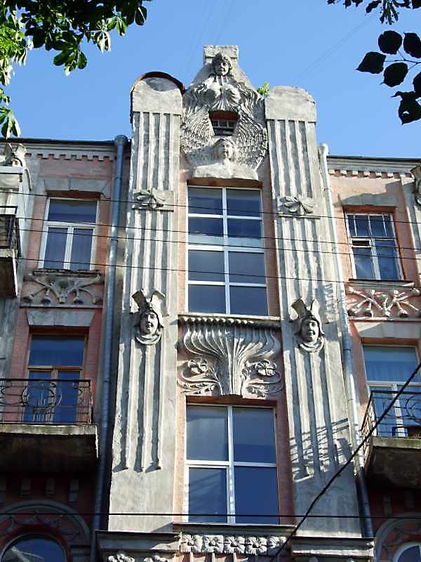 4-5-й поверхи сходової клітки Розмір зображення: 600:800 піксел 2008 р. 25 червня. Фото М.І.Жарких. Вкладені елементи Фронтон Маскарони і рельєфна вставка
