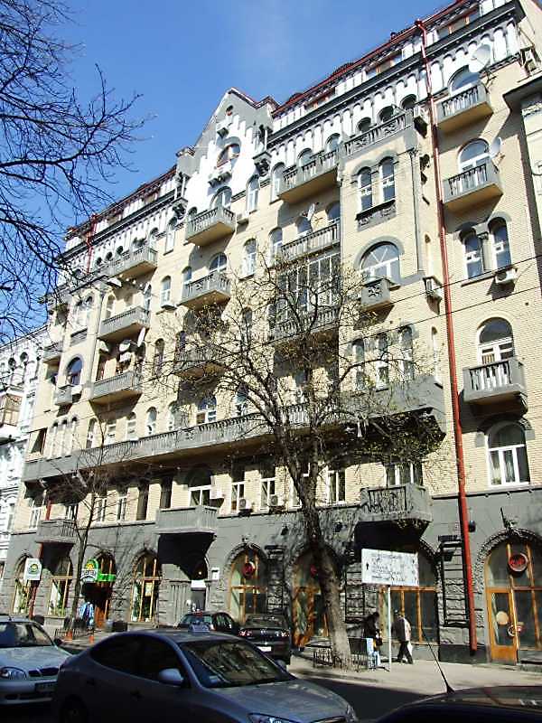 2009 р. Загальний вигляд Розмір зображення: 600:800 піксел 9 квітня 2009 р. Фото М.І.Жарких. Вкладені елементи Фрагмент 6-7-го поверхів Аркатурний пояс Гаргуйль (+) Вікно-біфорій 4-го поверху Консолі балкону 3-го поверху