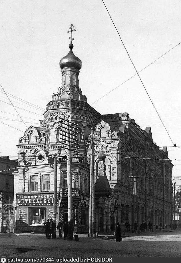 1900..1915 рр. Загальний вигляд зі сходуРозмір зображення: 634:921 піксел Фото опублікував Олег Заварзін 11.10.2019 р. Церква св. Іоана Золотоустого, збудована за проектом Є. Єрмакова. |