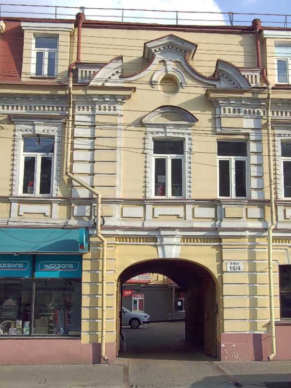 2021 р. Центральна частина фасаду по вул. Верхній ВалРозмір зображення: 600:800 піксел Фото М. І. Жарких, 1 квітня 2021 р. |
