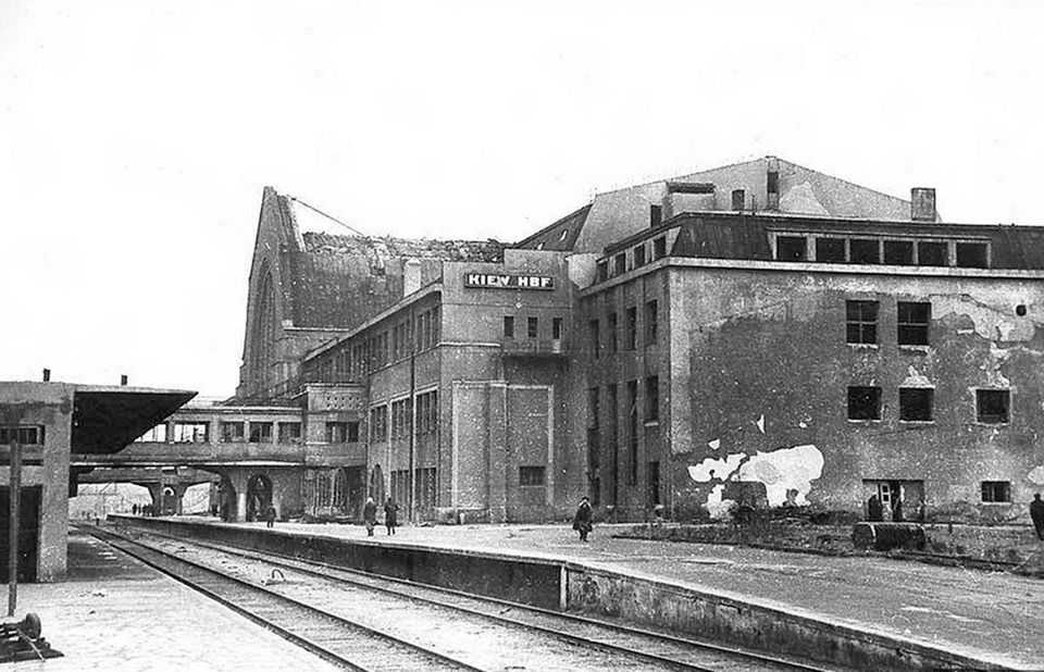 1943 р. Загальний вигляд з півдняРозмір зображення: 960:618 піксел Напис на зруйнованому вокзалі – німецький. Фото опублікував Emil Oleksandrovich 3.10.2018 р. |