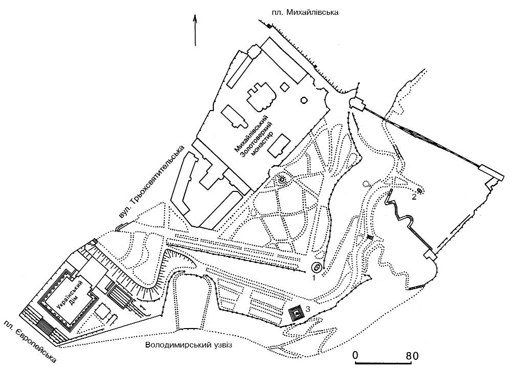 Вул. Трьохсвятительська. На верхній та середній терасах східної частини Старокиївського плато та його схилах. Головні входи – з площ Михайлівської та Європейської.