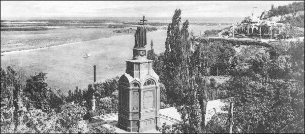 Володимирська гірка в Києві на початку XX століття. Праворуч – вид на Купецький сад. Із 1982-го на цьому місці стоїть арка на честь возз’єднання України з Росією. Кияни називають її ”хомутом”.
