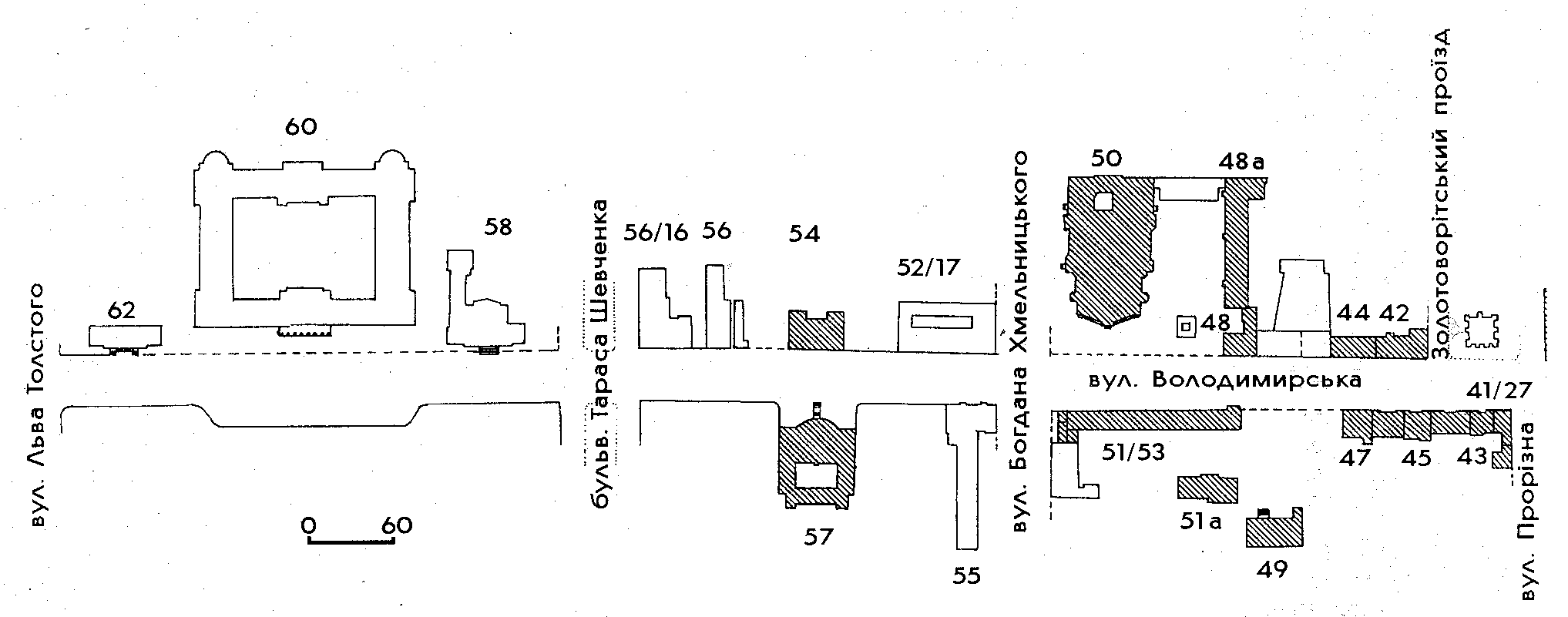 План забудови (42 – 62)Розмір зображення: 2035:801 піксел Джерело: Звід пам’яток історії і культури України. – К.: 1999 р., т. 1 (Київ), с. 252. |
