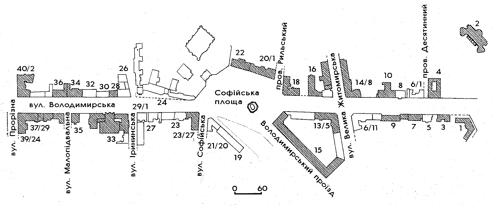 План забудови (1 – 39)Розмір зображення: 2076:858 піксел Джерело: Звід пам’яток історії і культури України. – К.: 1999 р., т. 1 (Київ), с. 252. |