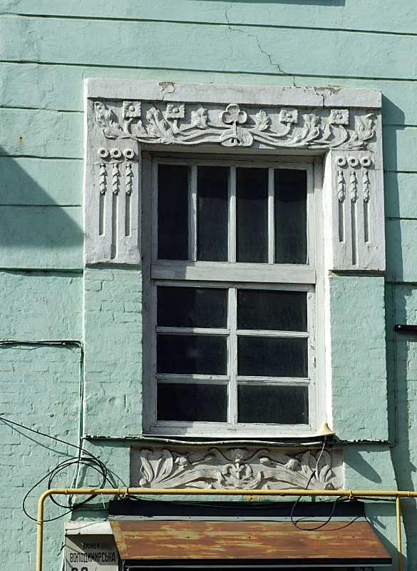 Сецесійне вікно 2-го поверху сходової кліткиРозмір зображення: 585:800 піксел Фото М. І. Жарких, 13 березня 2020 р. |