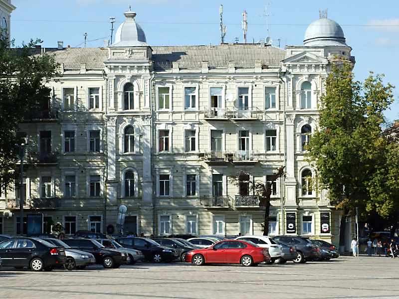 2007 р. Фасад з боку Софійської площі Розмір зображення: 800:600 піксел 3 серпня 2007 р. Фото М.І.Жарких. Вкладені елементи Центральна частина фасаду (+) Наріжна частина фасаду (+)