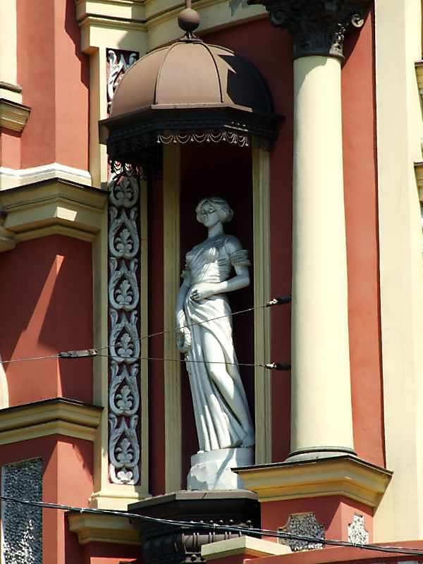 Скульптура на фасаді по вул.Володимирській Розмір зображення: 600:800 піксел 18 липня 2007 р. Фото М.І.Жарких. Вкладені елементи Анфас