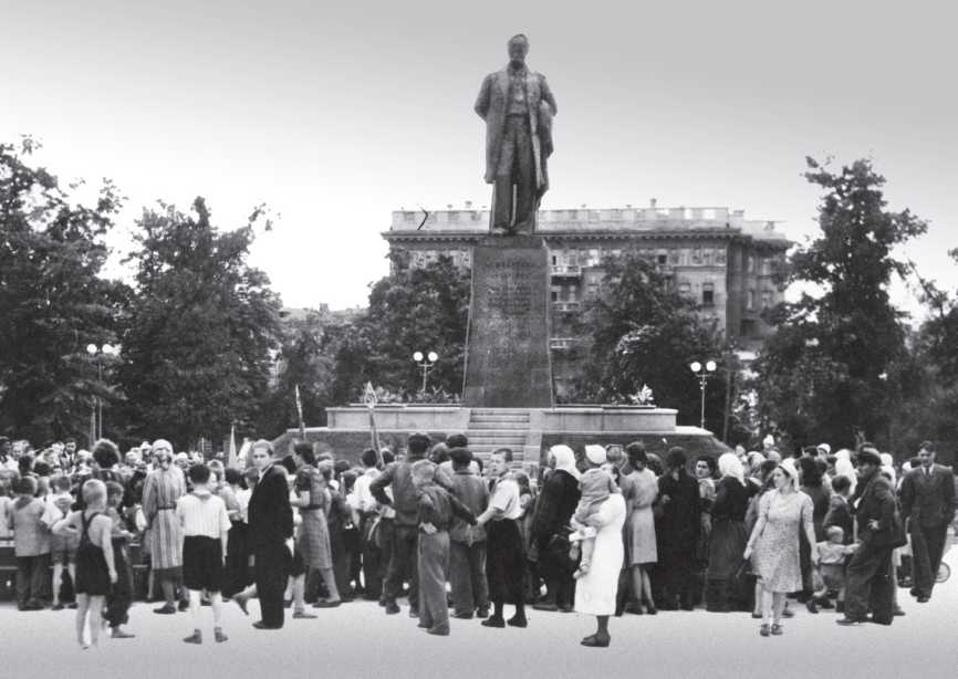 Пам’ятник Т. Шевченкові у Києві. Фото. 1940-і рр. [Кучерук О. перед Київським університетом. – Київ: Фундація ім. О. Ольжича, 2014 р.]