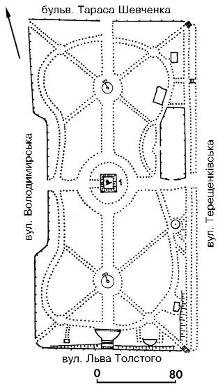 Регулярне розпланування прямокутного в плані парку (320,0 × 150,0 м) ув’язане з навколишньою забудовою: головна композиційна вісь – поперечна алея – орієнтована на портик головного корпусу університету, перпендикулярна до неї поздовжня алея – на вхід до колишнього будинку Першої гімназії. На їхньому перетині розташована кругла площа з пам’ятником Т. Шевченку, що є композиційним і змістовим центром парку. Діагональні алеї парку починаються чотирма наріжними входами. На їхньому перетині з поздовжньою алеєю містяться два симетрично розташовані майданчики з фонтанами.